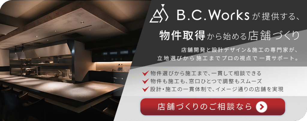 B.C.Worksでは、業態や立地に最適化された空間づくりをトータルでサポートしています。物件選びから設計・施工、さらには運営・管理に至るまで、空間づくりのすべての工程をワンストップでご支援いたします。